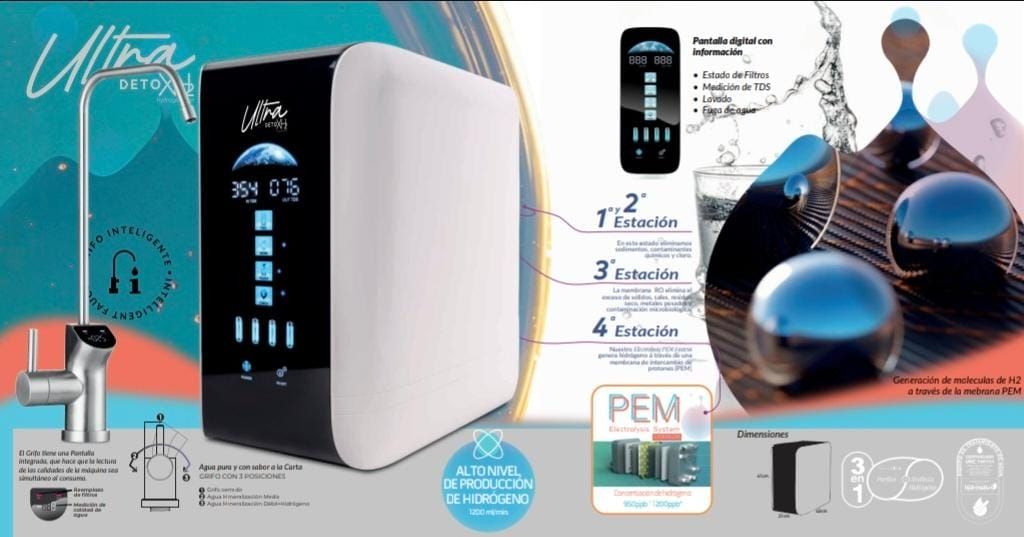 - *Calidad del Agua: Con nuestro sistema Ultra DetozH²* aseguramos que el agua que consumes sea de la mejor calidad y contenga una concentración adecuada de hidrógeno, ya que esto multiplican los beneficios.