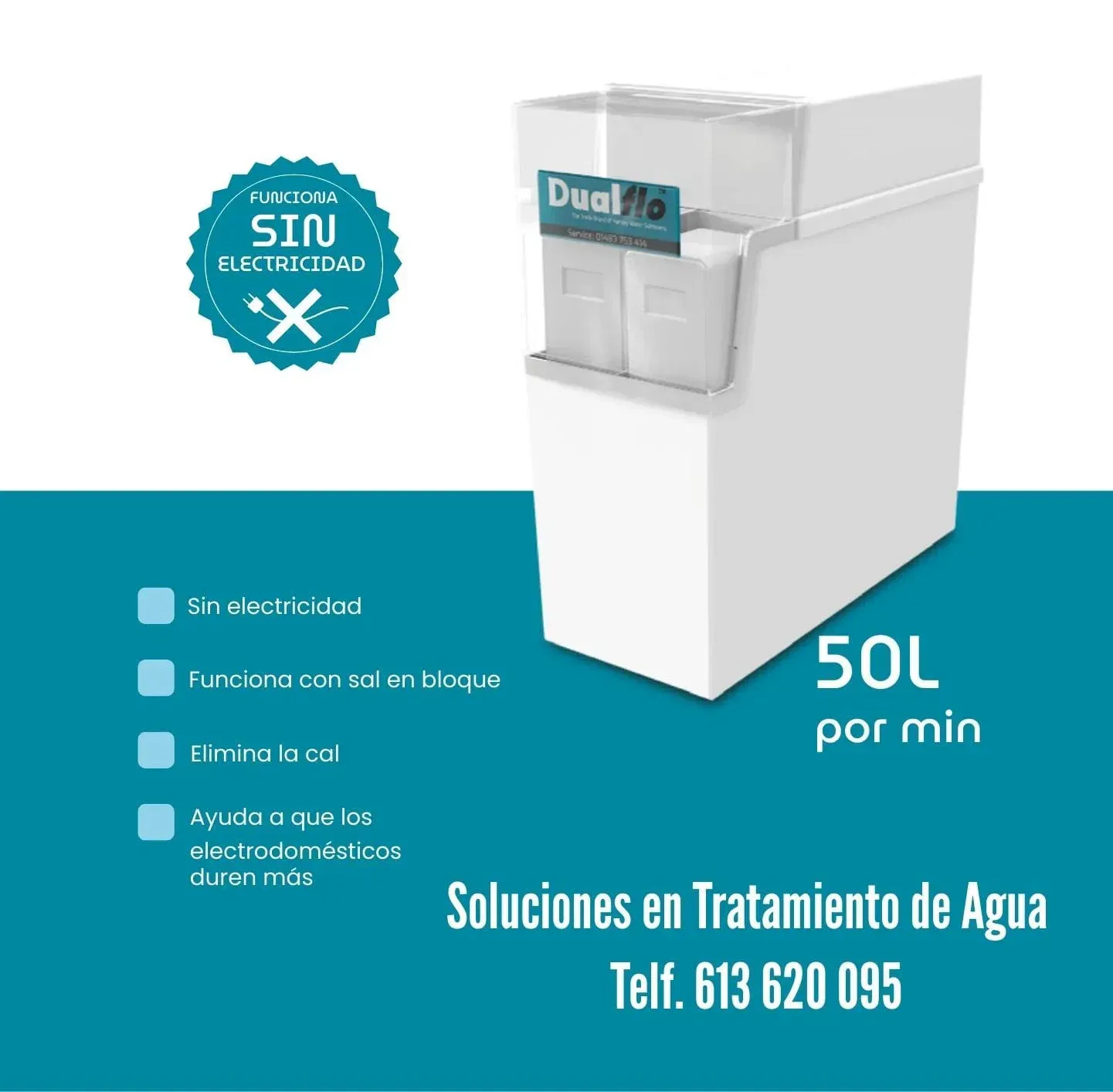 - Con el descalcificador de agua Dualflo, podrás disfrutar de un hogar sin incrustaciones, menos tiempo de limpieza, ahorro energético, y piel y cabello más suaves en tu ducha ¡Todo esto sin electricidad y con sal en bloque!